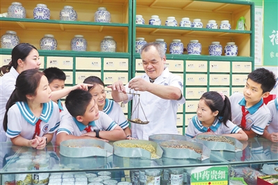 | ▶ 6月19日,上高县中医院医务工作者正指导青阳小学的孩子们体验称量中药材。端午节,人们有采草药、挂艾草、洗草药水、点雄黄等与中草药相关的习俗。