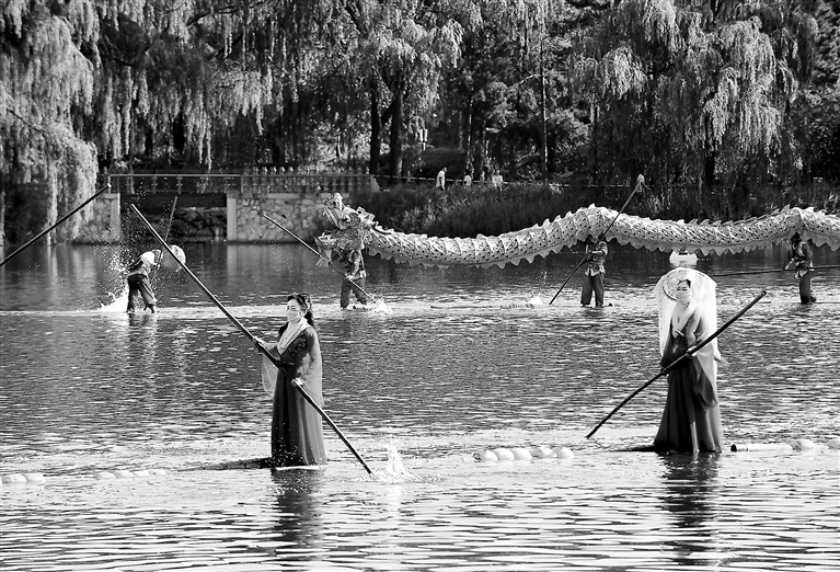 ▲6月22日,独竹漂表演者在北京圆明园九州景区的后湖进行水上表演。 新华社记者 罗晓光摄