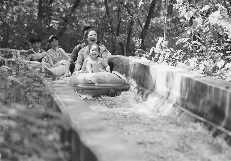 6月23日,游客在山东省沂南县铜井镇竹泉村体验丛林漂流。