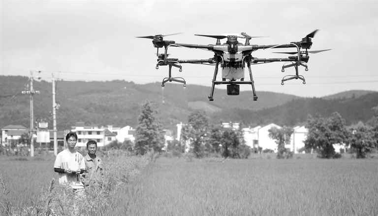 6月27日,在新余市渝水区界水乡横塘村,农技人员正在操控无人机喷洒农药。当地积极组织农技人员深入田间地头普及农业技术知识,提高种植户田间科技管理水平,为农业增产提供有力保障。本报全媒体记者 张翰林摄