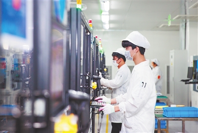 6月28日,在鹰潭国家高新技术产业开发区的江西弘信柔性电子科技有限公司厂房内,员工正在操作智能生产设备。该公司通过自主研发与创新,成为5G及柔性运用领域重要元件制造商,产品广泛运用于5G通信、物联网应用等领域。本报全媒体记者 吴福清摄