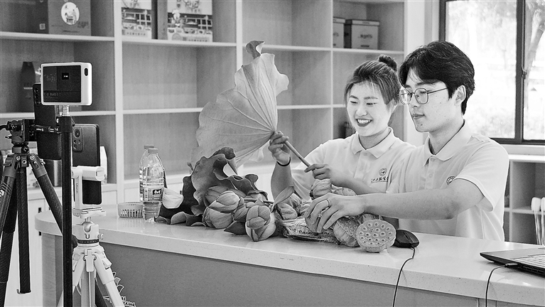 ▶暑期来临,江西服装学院社会实践队的学生们走进江西日报社乡村振兴示范基地南昌县黄马乡罗渡村,开展主题为“为爱发声 以声传情”的暑期“三下乡”社会实践活动。图为大学生在为农户视频直播带货。 通讯员 李竹新摄