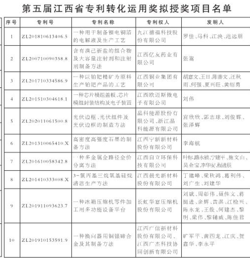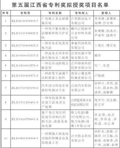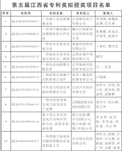 附件:1.第五届江西省专利奖拟授奖项目名单