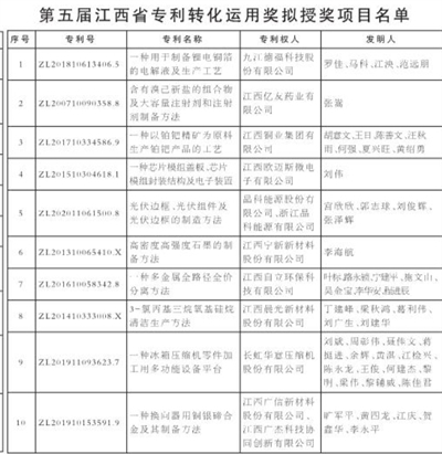 根据《江西省专利奖励办法》及其实施细则和《江西省市场监督管理局关于做好第五届江西省专利奖推荐工作的通知》要求,经形式审查、初评(包括专家网评和专家会评)、省专利奖评审委员会评审、省专利奖励工作部门联席会议审定,评选出第五届江西省专利奖拟授奖项目20项(其中,江西省专利奖10项、江西省专利转化运用奖10项)。