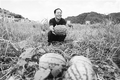 6月29日,万年县上坊乡港边村委会茅溪村小组村民郑高峰正在地里采摘西瓜。郑高峰在外务工多年,看准果蔬消费市场返乡创业,走上了发展果蔬产业的致富路。特约通讯员 徐声高摄