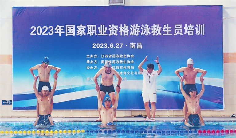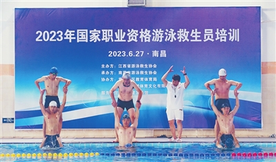 潜泳、拖带、心肺复苏……6月26日,南昌市青云谱区青少年校外活动中心游泳池内,60名备考游泳救生员国家职业资格证的学员正在国家职业资格培训师的指导下接受专业培训。这是省体育局将游泳救生员国家职业资格培训送到基层的一个缩影,也是为群众办实事的生动实践。