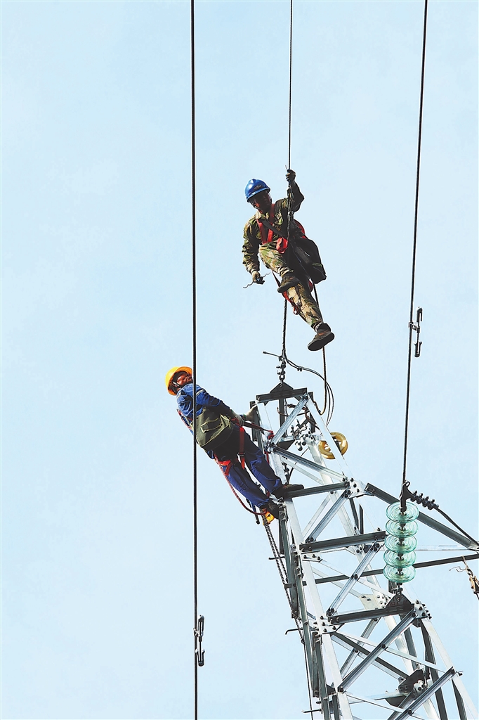 7月3日,在乐安县金竹畲族乡,电力工人冒着高温在35千伏新建线路施工现场高空作业,保障电网供电安全。