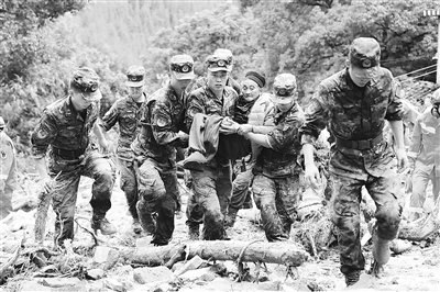 7月4日,在重庆市万州区长滩镇,武警官兵在转移被困群众。