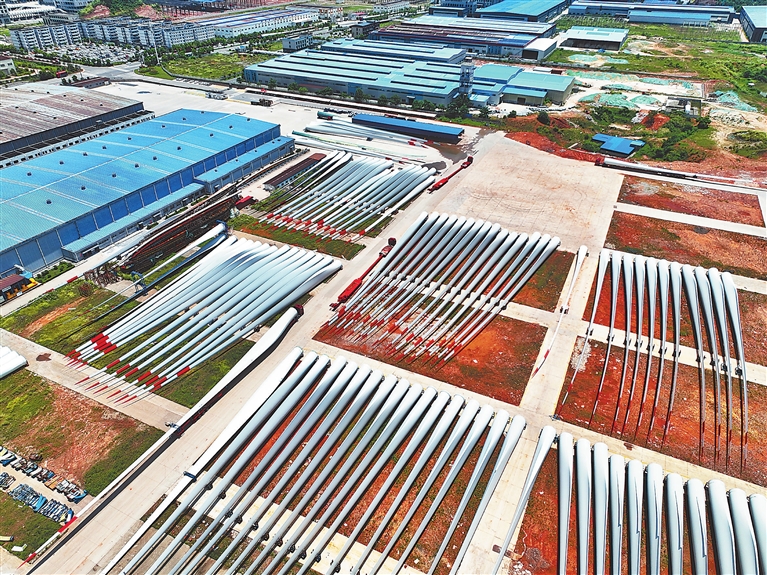 ▲ 7月3日,在芦溪工业园内,中材科技(萍乡)风电叶片有限公司生产制造的风电叶片正准备装车外运。通讯员 王 强摄