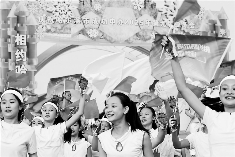 7月8日,在哈尔滨市太阳岛景区太阳石广场,演职人员庆祝哈尔滨市获得2025年第九届亚洲冬季运动会举办权。新华社记者 石 枫摄