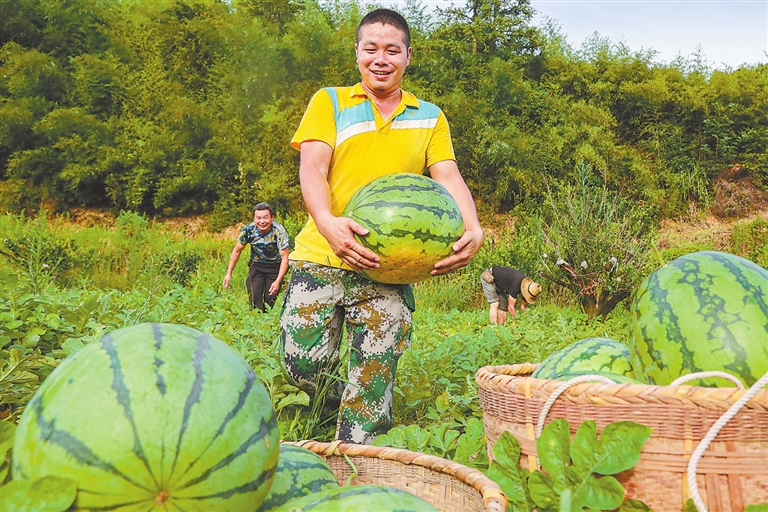 7月3日,南丰县莱溪乡上潺村的西瓜进入成熟期,农民开始采摘、外销。近年来,南丰县以“一村一品”模式加快推动传统农业向特色农业、高效农业转变,促进农业增效、农民增收。