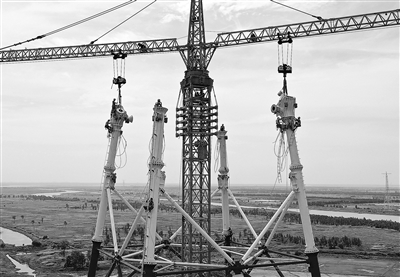 ▲ 7月7日,在南昌县蒋巷镇的赣江南支江畔,武汉-南昌双回1000千伏特高压交流线路工程百米跨越塔上,安徽送变电工程有限公司40多名特高压工程建设者在安装钢管。连日高温,施工方项目部严格落实防暑降温措施,采取错峰和轮换作业,确保特高压工程早日建成。据悉,该塔是目前世界上塔头最大的特高压单回路酒杯铁塔,预计7月底前完成封顶施工。