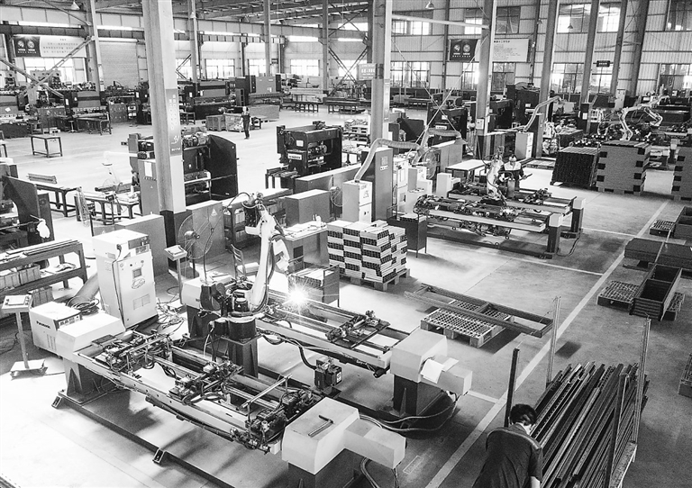 ◀ 7月6日,位于樟树市金属科技产业园的江西金虎保险设备集团有限公司,5G+数字智慧工厂的焊接机器人正在焊接密集架构件。近年来,作为“中国金属家具产业基地”的樟树市,以“智造”提升产业核心竞争力,加快推动金属家具传统产业向数字化、智能化转型升级,促进当地经济高质量发展,目前金属家具产品市场份额占全国的33%。本报全媒体记者 李 劼摄