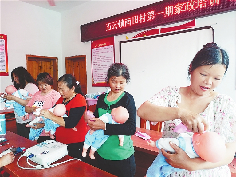 钟永兰、罗桂香之所以如此“抢手”,是因为她们“师出同门”——南田月嫂(育婴师)培训班。南田村驻村第一书记夏云告诉记者,该村位于赣县区五云镇西北部,G105国道穿村而过,距离赣州市中心城区仅18公里,有686户、2840人,其中20至60岁的妇女近千人,许多村民白天在市区打零工,晚上再回家住宿,基本可以维持生计。但从长远计,五云镇党委政府、南田村委会开展深入调研,发现近年来家政服务需求不断增长,行业营收年均增速保持在20%左右。但是,与此对应的是,一些农村劳动者误认为“当保姆”是一件难为情的事,传统思想观念根深蒂固。