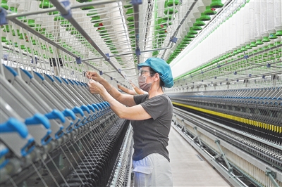 7月7日,在于都县的江西卫棉纺织有限公司生产车间内,工人正加紧赶制棉纺产品。该企业已实现粗细络联、自动打包一体化,是行业领先的智能化、数字化民营纺织企业。企业订单已排至11月份,预计今年年销售额可达5亿元。 王蕴蓉摄