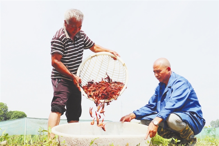7月10日,奉新县干洲镇溪泮村,小龙虾养殖户正在捕捞小龙虾,准备投放市场销售。近年来,该镇大力发展特色种养产业,带动农民增收,助力乡村振兴。通讯员 王 萍摄