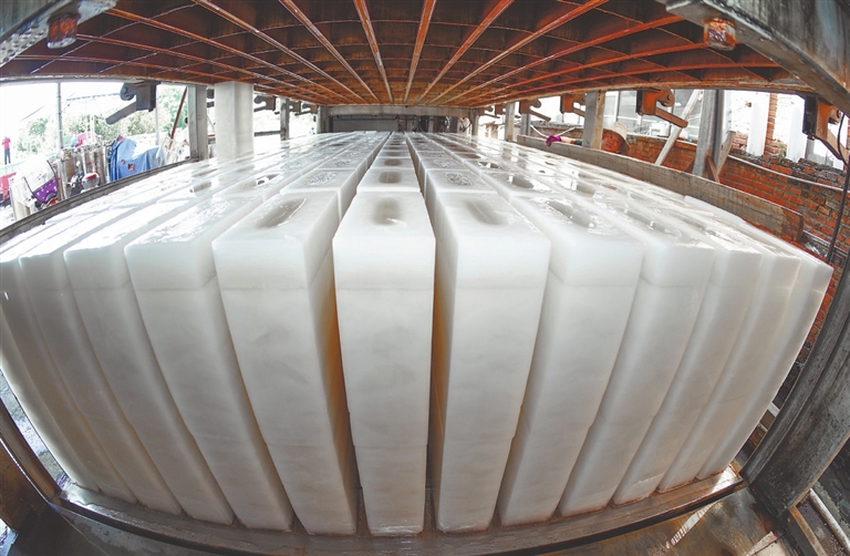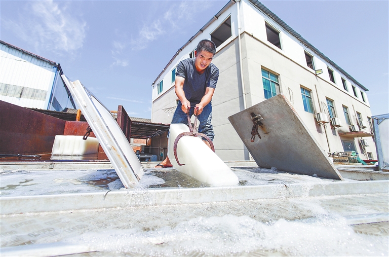 连日来,我省持续高温天气。7月11日,在南昌县蒋巷镇一家制冰厂内,工人师傅正在制冰、运冰。据了解,该制冰厂日均产冰300余块,约15吨,主要满足水产市场、水果批发集散点和其他高温作业场所物理降温需求。