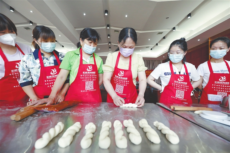 7月7日,在吉安市吉州区白塘街道开办的就业技能(中式面点师)培训班上,面点师在教学员制作酸奶麻花。吉州区白塘街道聚焦市场紧缺与企业急需的人才,对失业人员、返乡创业农民等有创业意愿和培训需求的人员,开展免费就业技能培训,为他们拓宽就业渠道。