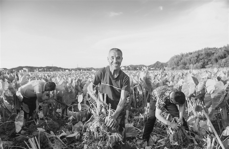 7月11日,在铅山县紫溪乡紫溪村红芽芋种植基地,村民脸上洋溢着丰收的喜悦。进入7月,该县10万亩红芽芋逐渐成熟。本报全媒体记者 吕玉玺摄