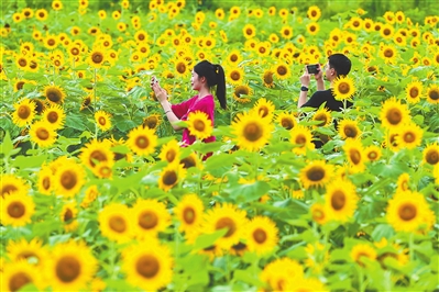 近日,万载县康乐街道里泉村润春园向日葵进入盛花期,100亩20万株的向日葵花海,迎着蓝天绽放,吸引市民前来打卡游玩。特约通讯员 邓龙华摄
