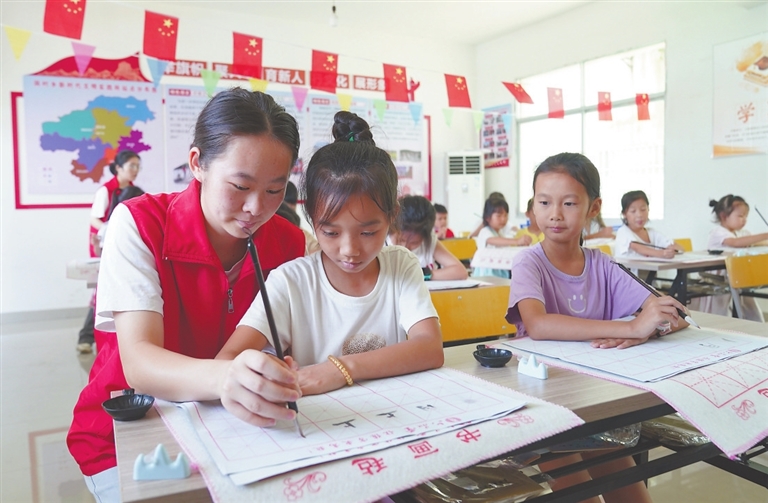 7月12日,在分宜县洞村乡留守儿童公益托管班,志愿者正辅导小朋友练习毛笔字。该县充分调动各方资源,利用社区(农家)书屋、新时代文明实践阵地等场所,开设暑期公益托管班,免费为留守儿童提供暑期托管服务。