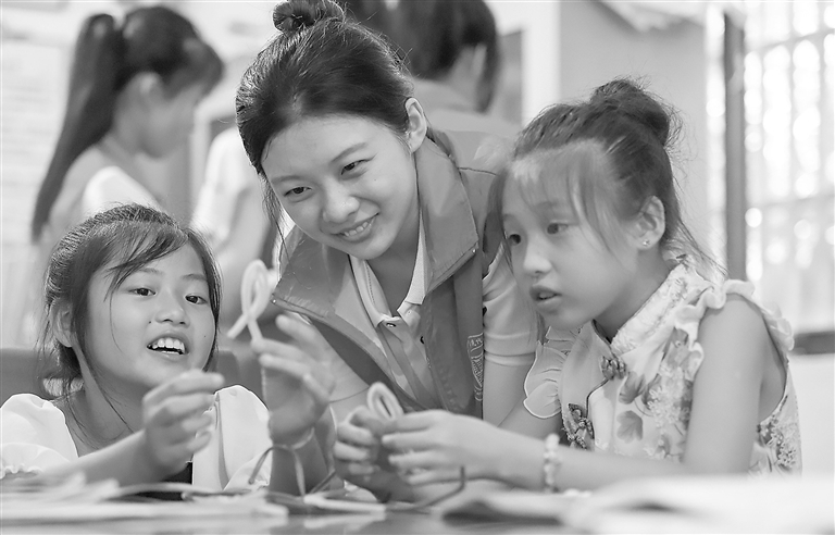 | ▶7月12日,在余干县梅港乡蛟龙村,江西财经大学的大学生志愿者与孩子们一起用扭扭棒制作手工作品,丰富孩子们的暑期生活。