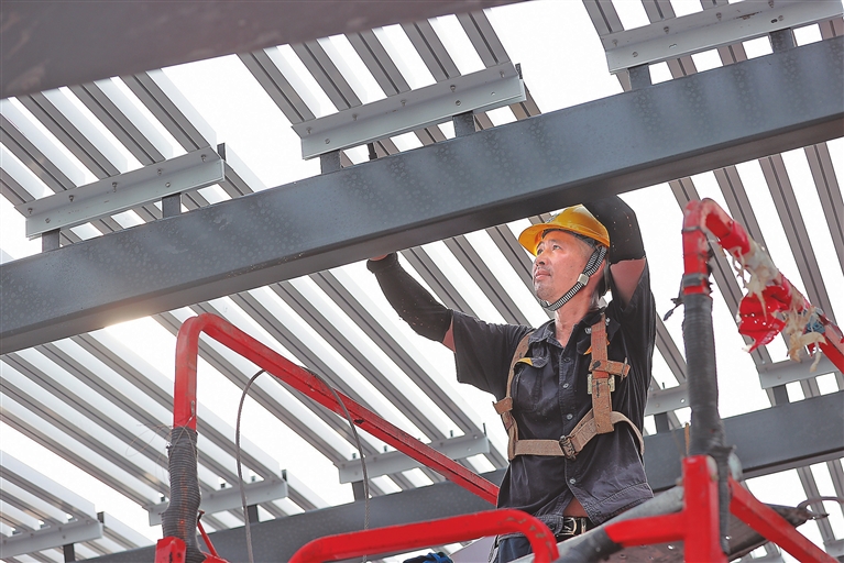 7月13日,景德镇国际陶瓷博览交易中心(陶博城)三标段,中铁四局市政公司建设者在高温下进行屋顶格栅装饰收尾施工。陶博城集陶瓷贸易、展览、研学、旅游等多种业态于一体,是景德镇高质量推进国家陶瓷文化传承创新试验区建设的重点项目。