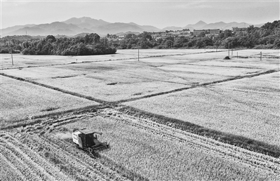 ▲ 7月14日,乐安县公溪镇荷陂村,收割机在田间穿梭抢收早稻。盛夏时节,稻黄谷香,当地种植户加强夏收、夏种、夏管,田间地头一派丰收景象。 本报全媒体记者 徐 铮摄
