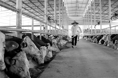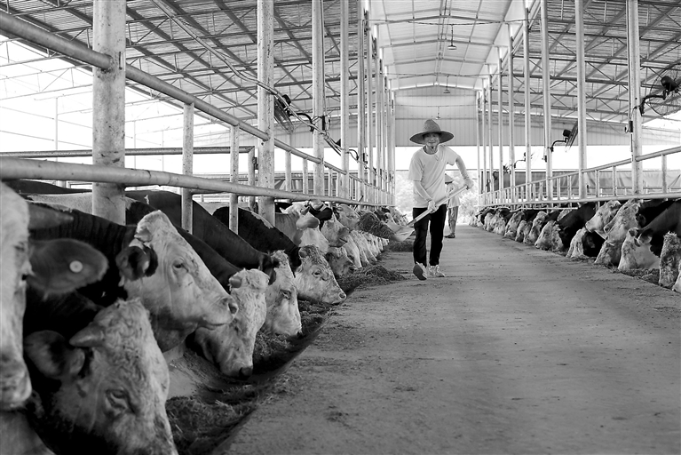 7月4日,大余县青龙镇赤江村肉牛生态养殖基地饲养员正在喂养西门塔尔牛。近年来,该村通过党建引领,采取“公司+村集体+农户”的发展模式,壮大养牛特色产业,实现村民和村集体经济增收的双赢。