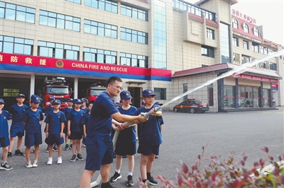 7月17日,峡江县消防救援大队消防员教孩子们使用消防水枪。该县开展“红领巾 火焰蓝”暑期社会实践活动,让孩子们增强消防安全意识。通讯员 曾 玲摄
