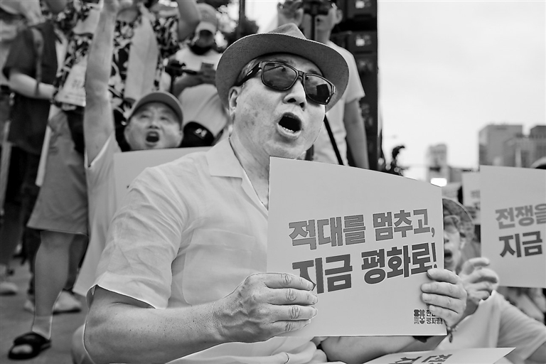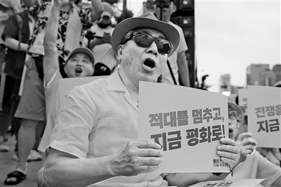 参与反战游行的人群高喊口号,手举“停止韩美联合军事演习”“反对韩美日军事合作”“停止敌对行动、走向和平”等标语,从首尔广场一路行进至光化门广场,提议通过对话合作、而非制裁和军事威胁解决半岛问题,呼吁停止半岛及亚洲地区的军备竞赛、构建没有核威胁的朝鲜半岛。