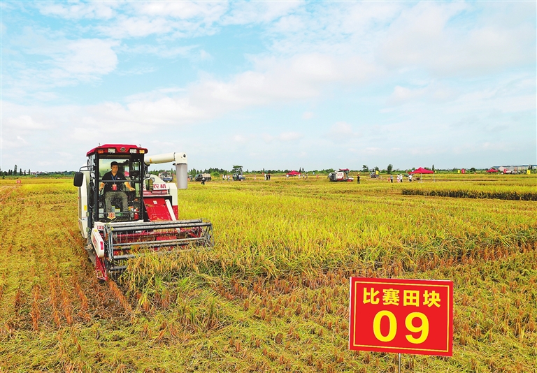 7月20日,“2023年江西省水稻机收减损技能大比武”在新余市渝水区姚圩镇新宋村水稻种植基地拉开帷幕,来自全省11个地市的农机手们熟练驾驶联合收割机,同场比拼粮食机收减损技术。