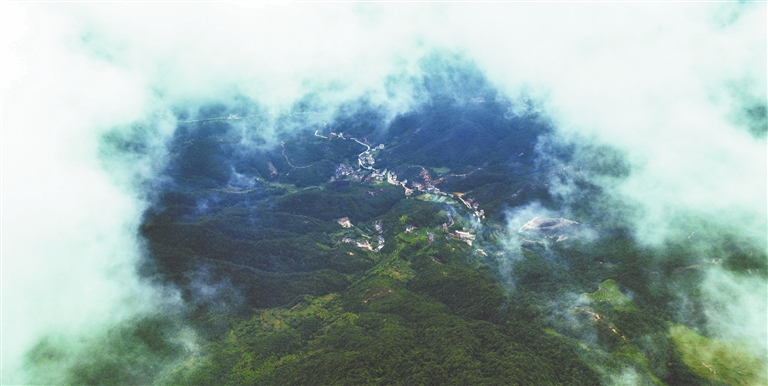 7月17日,赣州市章贡区境内的江西峰山国家森林公园出现云海景观,宛若人间仙境。该景区管理处工作人员正在进行巡山巡护工作。