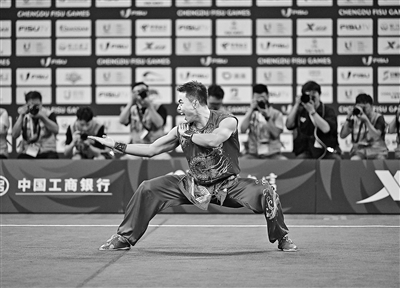 29日上午,在城北体育馆举行的武术比赛中产生成都第31届世界大学生夏季运动会首枚金牌。中国队选手曹茂园以9.770的最高分获得男子南拳项目冠军。图为曹茂园在比赛中。新华社记者 蔡湘鑫摄
