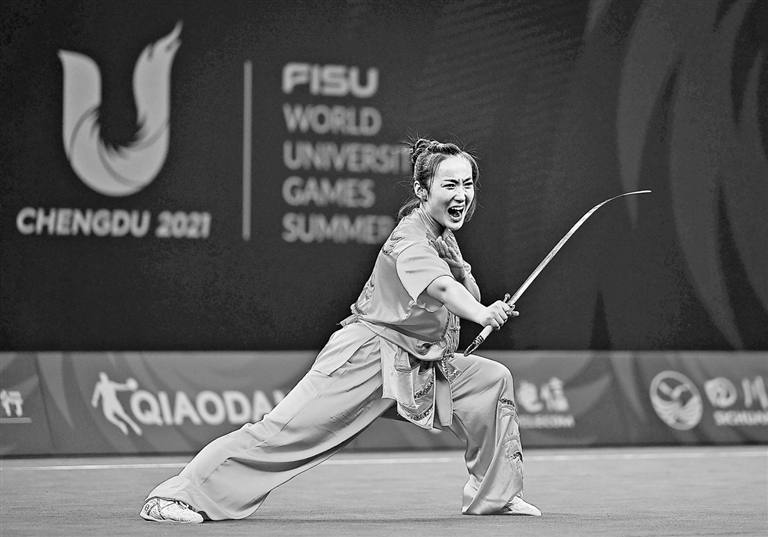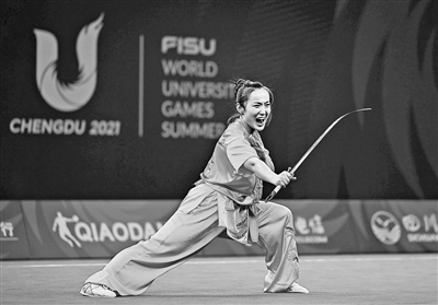 当日,在成都举行的第31届世界大学生夏季运动会武术项目女子南刀比赛中,中国选手宋翠芳以9.666分的成绩获得冠军。图为宋翠芳在比赛中。