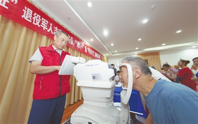 7月25日上午,南昌经开区蛟桥街道枫联社区比往常热闹了许多,20余名南昌市“新长征”退役军人志愿者来到这里,开展迎“八一”暨“平安护夏”志愿服务活动。在党群服务中心,志愿者通过裂隙灯、验光仪等专业设备为居民进行眼部检查,给予他们眼部护理的科学指导,并提出合理的治疗建议;在居民家中,志愿者分工协作,完成了空调外机拆卸、空调过滤网清洗及空调内部冲洗消毒等工作;在建设工地,志愿者将精心准备的解暑物品,分发至工人手中,为他们带来清凉。