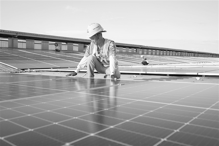 7月27日,在中铁十五局集团电气化公司新余光伏发电项目施工现场,工作人员正抓紧作业。该项目投资3950万元,推进屋顶空间与光伏发电融合应用,建设新能源发电装机容量10兆瓦,建成后预计年发电量960万千瓦时。