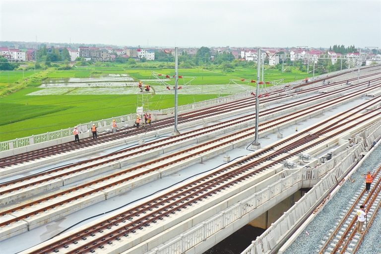 8月1日,在昌景黄高铁鄱阳县境内,中国铁路南昌局集团有限公司鹰潭供电段的工作人员正在对高铁供电设备进行静态验收作业,为全线开通运营作准备。据悉,昌景黄高铁西起江西南昌,经瓷都景德镇,东至安徽黄山,是构建赣中地区至长三角地区客运的快速通道,对于提升沿线运输能力、开发旅游资源,具有重要意义。本报全媒体记者 洪子波摄