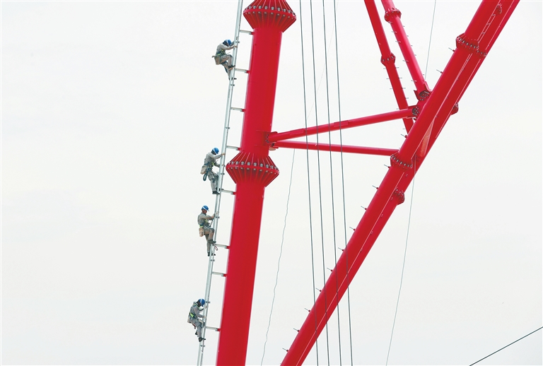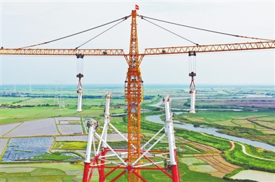 骄阳似火,热浪袭人。7月7日,南昌县蒋巷镇的赣江南支江畔,安徽送变电工程有限公司40多名特高压工程建设者,依然坚守在武汉至南昌双回1000千伏特高压交流线路工程LN4078号跨越塔建设工地上,在百米高空的工作岗位上尽情挥洒汗水。连日高温,施工方项目部严格落实高温天气防暑降温措施,采取错峰和轮换作业,充分利用早晚有效施工时间,在保障安全的前提下,全力以赴加快建设进度,确保特高压工程早日建成。