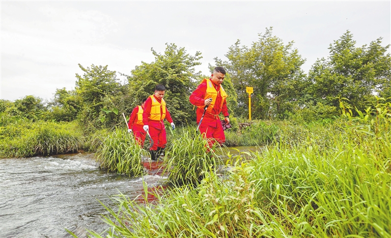 7月7日,永修县滩溪镇下湾村,室外气温超过38℃。廖涛和队友余静、孙学金沿着从水下穿过的燃气管道,蹚水走过一条小溪来到对岸,利用探管仪进行定位,查看管道埋深是否存在变化,并清除标识桩旁的杂木。