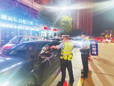 本报讯(易永艳)7月31日20时起,按照省公安厅第三次夏夜治安巡查宣防集中统一行动部署,湖口县公安局禁毒大队联合县交管大队在县城严查毒驾、酒驾、醉驾以及是否携带毒品、易制毒化学品等违法犯罪行为,对可疑驾驶人员进行唾液检测,最大限度遏制各类涉毒违法犯罪行为。同时民辅警还向司乘人员普及禁毒知识及“毒驾”行为的严重危害,警示广大驾驶员要自觉抵制“毒驾”行为。