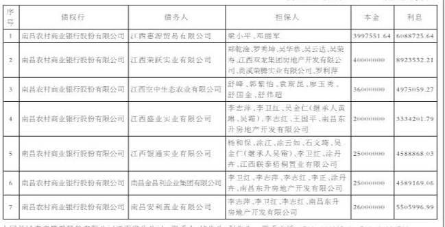 根据南昌农村商业银行股份有限公司与中国长城资产管理股份有限公司江西省分公司签署的《资产转让协议》,南昌农村商业银行股份有限公司将其对公告清单(见右表)所列借款人及其担保人享有的主债权及借款合同、担保合同、抵债协议、还款协议和其他相关协议项下的全部权利,依法转让给中国长城资产管理股份有限公司江西省分公司。南昌农村商业银行股份有限公司特公告通知各借款人、担保人以及借款人、担保人因各种原因发生更名、改制、歇业、吊销营业执照或丧失民事主体资格等情况的相关承债主体或清算主体。