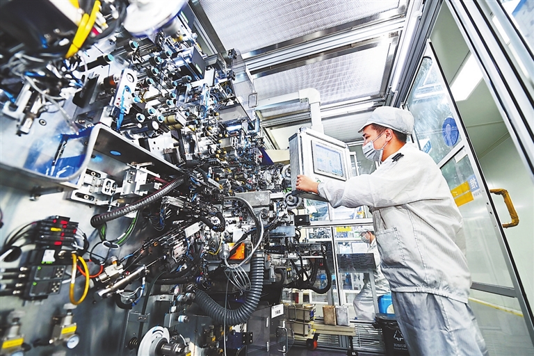 7月25日,安远县产城新区的一家锂电新能源电池生产企业,工人在加工出口的锂离子微型电池产品。近年来,赣州市大力扶持新能源产业,重点发展钢壳、软包、储能等锂电池产业和锂电新能源研发,助推区域经济高质量发展。