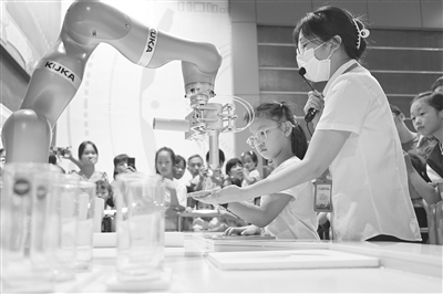 近日,省科学技术馆展厅内,观众在看柔性机器人表演。暑假期间,省科学技术馆迎来参观热潮,许多孩子在家长的陪伴下来到这里,近距离体验科普设备、感受科技魅力。王蕴蓉摄