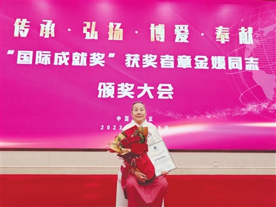 “请章金媛老师上台领奖。”主持人话音刚落,她立刻起身,同往常一样,不需要搀扶,一步一步走上台。