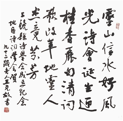行书斗方《上饶县诗学会成立纪念》(上图,上饶县现为广信区),是王克敌92岁时的作品,常见的飞白线条极少,而是墨色浓黑润泽,可见其运笔速度慢,笔笔杀纸,力透纸背,宝刀不老。