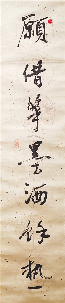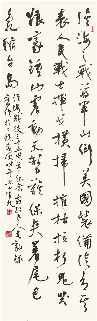 行书是王克敌一生创作最多的书体,传世的这类作品也多。在此展中,行书作品占了很大比例,形式有斗方、对联、条幅、中堂等。这件行书条幅《淮海战役三十五周年纪念》(下左图),是王克敌79岁时书写的一首自作诗。其线条稳健遒劲,运笔爽利潇洒,体现作者极佳的创作状态。作为创作生命近百岁的书家而言,80岁左右应该是其精力旺盛、书体成熟的创作黄金期。