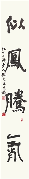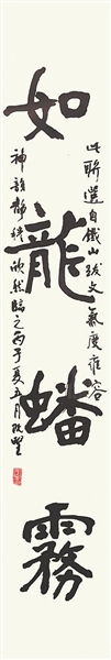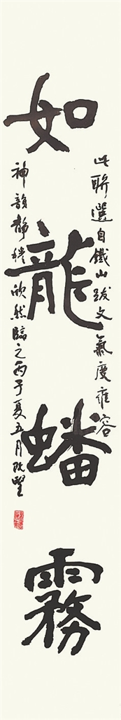 王克敌各种书体均有涉猎,博观约取,各体并进。在展厅中,隶书作品不多,一副楷隶对联《如龙蟠雾,似凤腾霄》(下中图)颇引人注目。此作以楷书结体,融入隶书笔意,为隶书向楷书过渡的书体。作品线条刚健,力透纸背,耐人寻味。从对联所题上款得知,此作为临写铁山跋文。