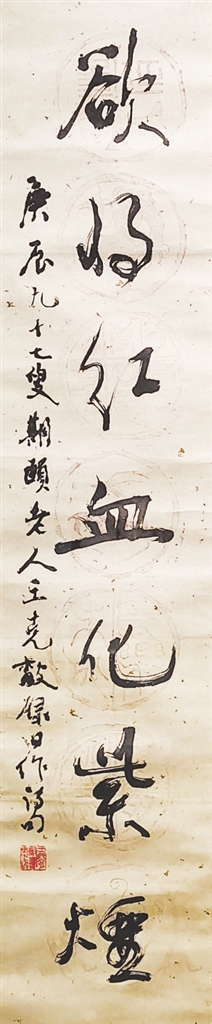 行书对联《愿借笔墨洒余热,欲将红血化紫烟》(下右图),是王克敌97岁去世那年的作品。真难以想象,近百岁老人能写出如此灵动、真气弥漫的精彩之作。对联没有题上款人,估计不是应索之作。书家给自己写作品,往往是在“欲书之时”,因而最能表达自己的真性情。从作品内容看,正是表达了一位迟暮老人对生命的豁达、对笔墨的珍爱,以及活到老、奉献到老的豪迈之情。这或可看作“霜红老人”王克敌一生的写照。
