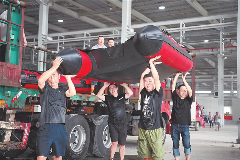 工作人员和志愿者在河北省涿州市钢研物资储备点内搬运捐赠的冲锋舟。 新华社记者 牟 宇摄
